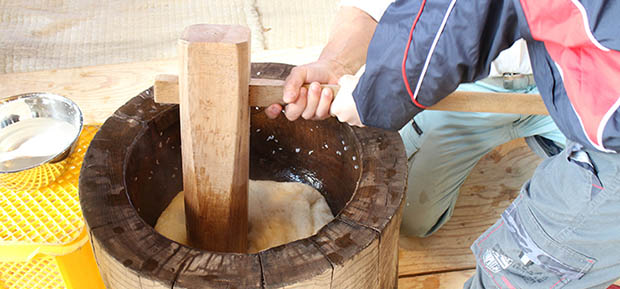 杵(きね) と 臼(うす)を使ってお餅をついてみよう!