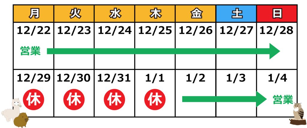 2025年12月29日(月)~2026年1月1日(木)まで休園日となります。