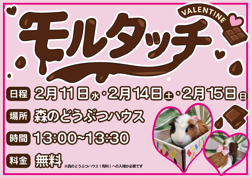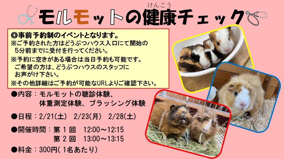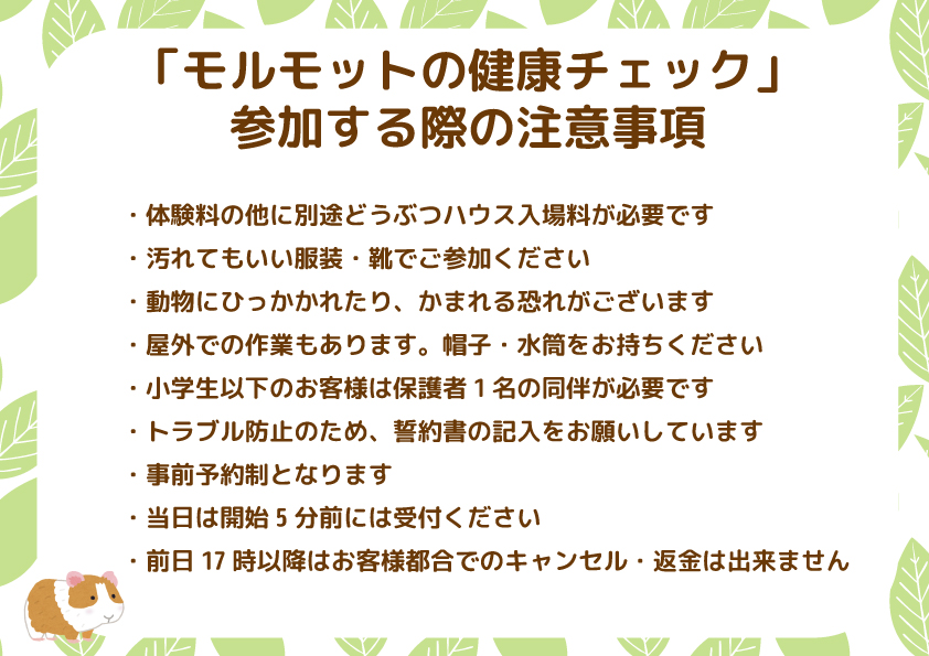 ※モルモットの体調により、イベントが中止となる場合がございます。 ※「森のどうぶつハウス」にご入場いただいた方のみ参加いただけます。 ※盛況の場合、表記時間より早めに受付を終了する場合がございます。 予めご了承ください。
